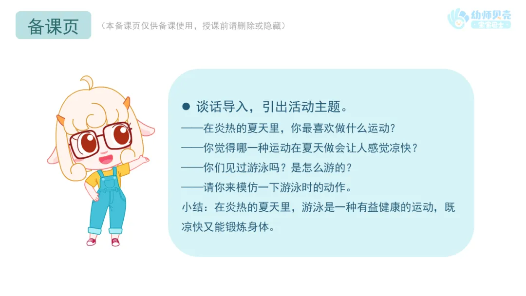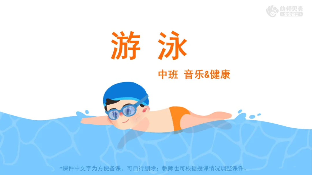 小结:游泳是一项有益健康的运动,它能让人的全身得到锻炼。游泳前,我们要做好各项准备,穿好泳衣,戴上泳帽和泳镜;不会游泳的人要带上泳圈,帮自己浮在水上,这样可以比较安全地学游泳。