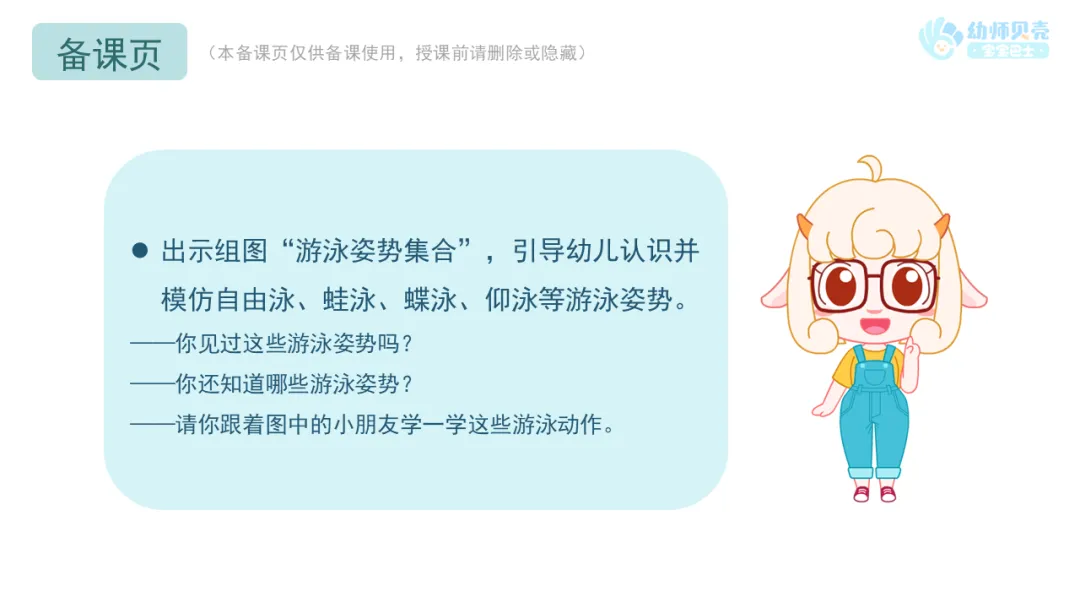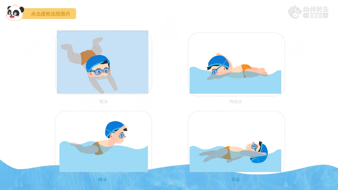 l出示组图“游泳姿势集合”,引导幼儿认识并模仿自由泳、蛙泳、蝶泳、仰泳等游泳姿势。