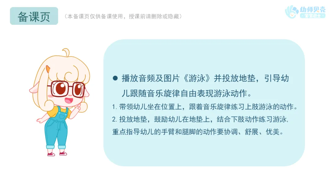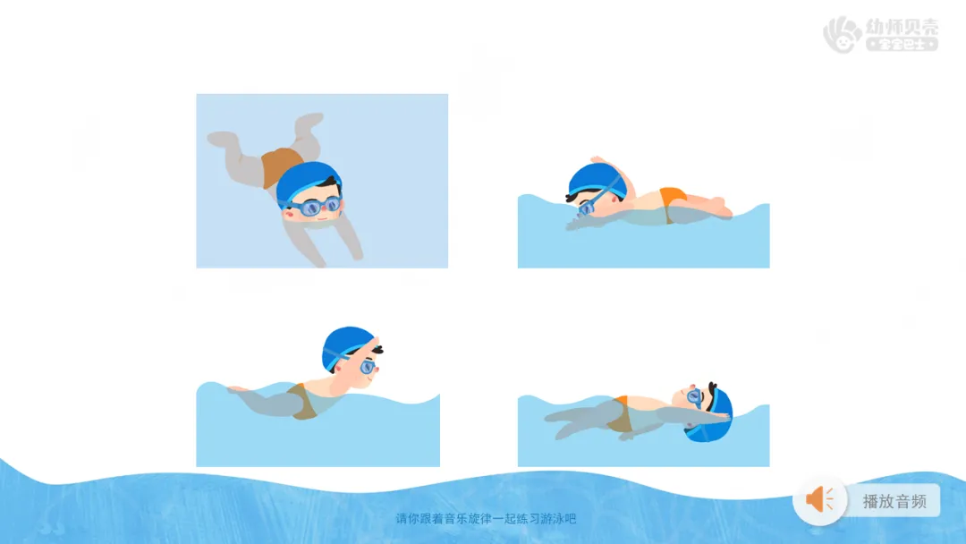 l播放音频及图片《游泳》并投放地垫,引导幼儿跟随音乐旋律自由表现游泳动作。