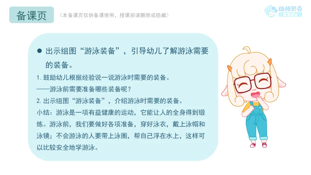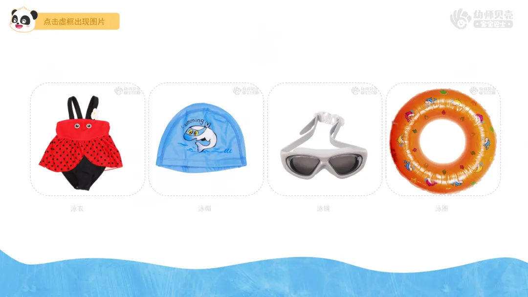 l出示组图“游泳装备”,引导幼儿了解游泳需要的装备。
