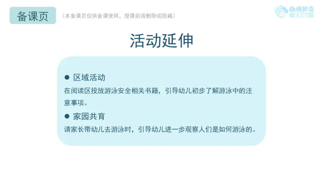 请家长带幼儿去游泳时,引导幼儿进一步观察人们是如何游泳的。