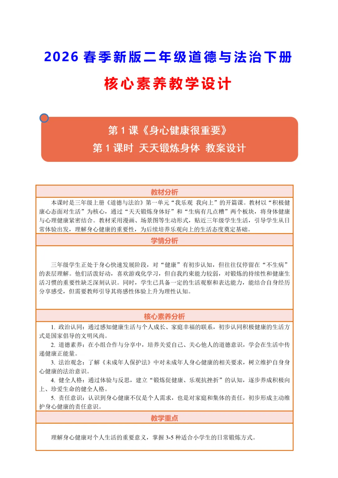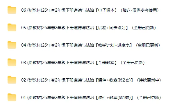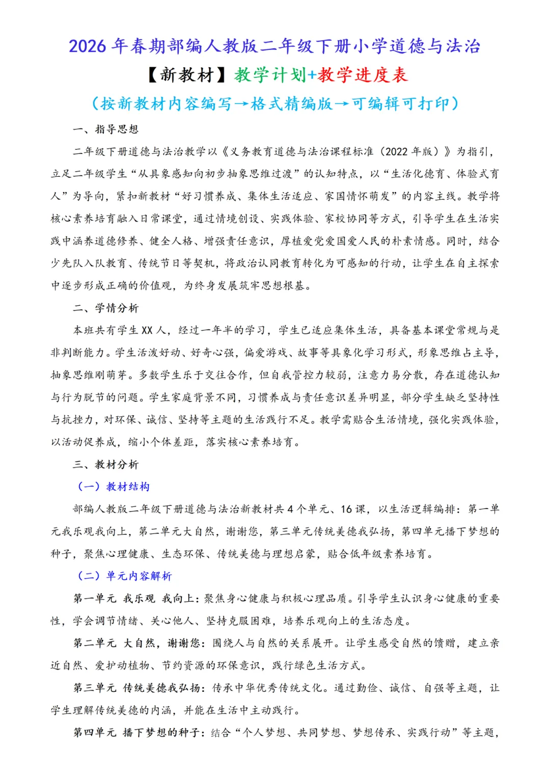 今日分享2026年春《二年级下册道法课件教案+教学计划+教学进度表》根据新版教材内容编写,电子版可编辑可打印,包括核心素养表格式教案设计、配套课件、同步练习和测试试卷等资料,内容丰富,开学必备。