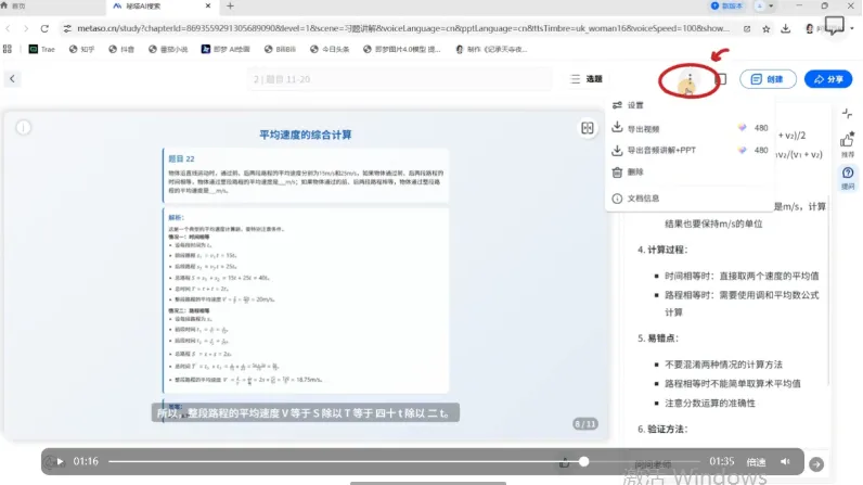 1导出/分享使用:需要的话,点击界面对应按钮,导出讲解视频或课件;课件可直接修改后用于课堂教学。