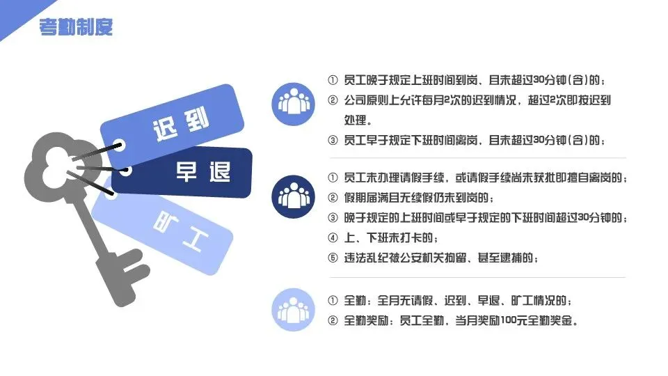 第八条 考勤标准:1. 工作时间:实行标准工时制,每日工作8小时,每周工作40小时,具体工作时间根据企业实际安排执行(如:上午9:00-12:00,下午13:30-18:30);2. 考勤方式:采用指纹打卡、人脸识别或企业指定考勤系统打卡,员工每日上下班需按时打卡,严禁代打卡、漏打卡,代打卡者与被代打卡者均按违规处理;3. 考勤异常处理:员工漏打卡、迟到、早退、旷工均属于考勤异常,漏打卡需在当日内提交《漏打卡说明》,经直属领导审批后,交人事行政部备案,每月漏打卡不超过3次,超过部分按迟到处理;迟到、早退15分钟以内(含15分钟),每次扣罚相应绩效工资;迟到、早退超过15分钟不满1小时,按旷工半天处理;迟到、早退超过1小时,按旷工1天处理;4. 旷工界定:未经审批擅自缺勤、请假逾期未归且未办理续假手续、伪造请假证明的,均视为旷工;旷工1天扣罚当日薪酬的2倍,月旷工累计3天(含3天)以上,视为严重违规,企业可解除劳动合同。