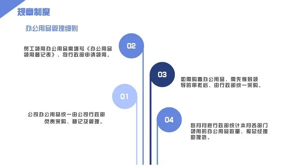 第二十条 办公用品领用:1. 办公用品实行“按需领用、节约使用”的原则,各部门指定专人负责本部门办公用品领用工作,每月固定日期(如每月5日),提交《办公用品领用申请表》,经部门负责人审批后,到人事行政部领用;2. 员工个人领用办公用品,需登记领用物品名称、数量、领用日期,按需领用,严禁浪费、私用办公用品,严禁多领、冒领;3. 易碎、易损办公用品(如打印机硒鼓、墨盒等),领用后需妥善保管,损坏、丢失的,按原价赔偿;4. 人事行政部定期盘点办公用品库存,及时补充短缺办公用品,核对领用台账,确保账物相符。