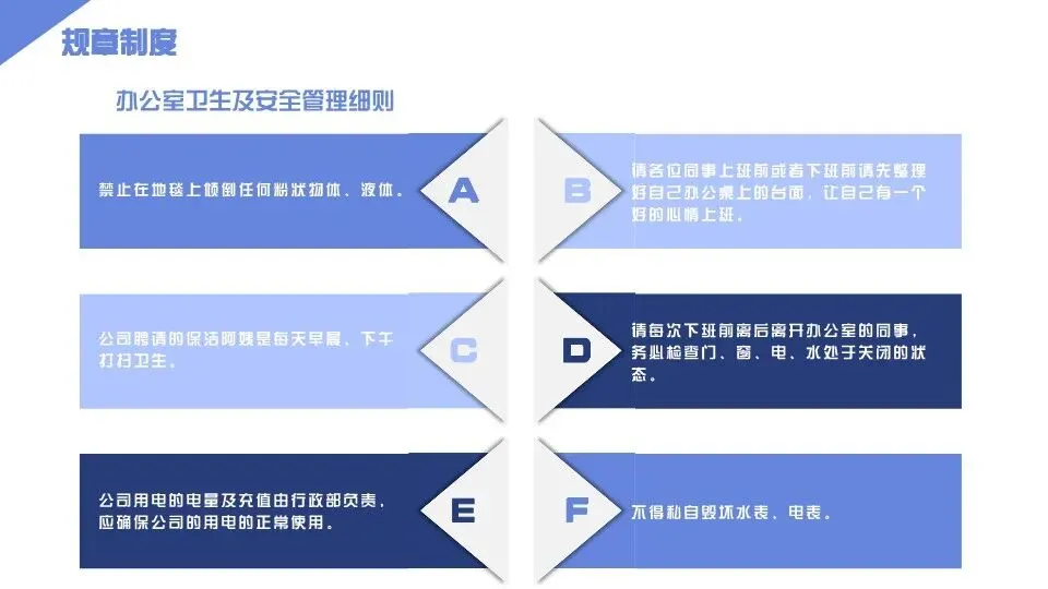 第十八条 卫生管理:1. 实行办公区域卫生责任制,各部门负责本部门办公区域卫生清洁,每日下班前清理个人桌面及周边卫生,每周进行一次全面清洁;2. 公共区域(走廊、会议室、卫生间、茶水间等)卫生,由人事行政部安排专人负责清洁,每日清洁不少于2次,确保公共区域整洁、卫生、无异味;3. 全体员工需自觉爱护公共卫生,不得随地吐痰、乱扔垃圾、乱涂乱画,严禁将垃圾堆放至公共区域角落。