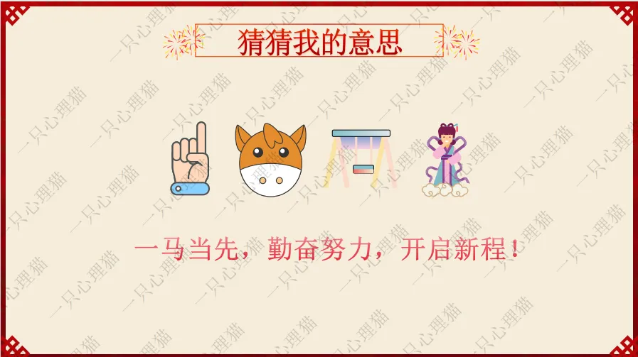 课程伊始,师生共同回顾心理课堂的四条约定——“倾听发言、尊重他人、保守秘密、投入课堂”,营造安全、接纳的课堂氛围。随后,教师以“表情包猜成语”游戏开启热身,学生们在“龙马精神”“一马当先”等趣味谜题中活跃思维,教师顺势送上“一马当先启新程”的祝福,巧妙引入马年主题,激发学生对课程的兴趣和期待。