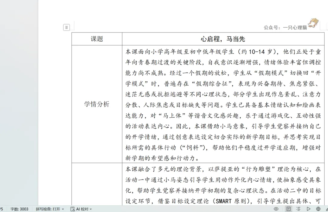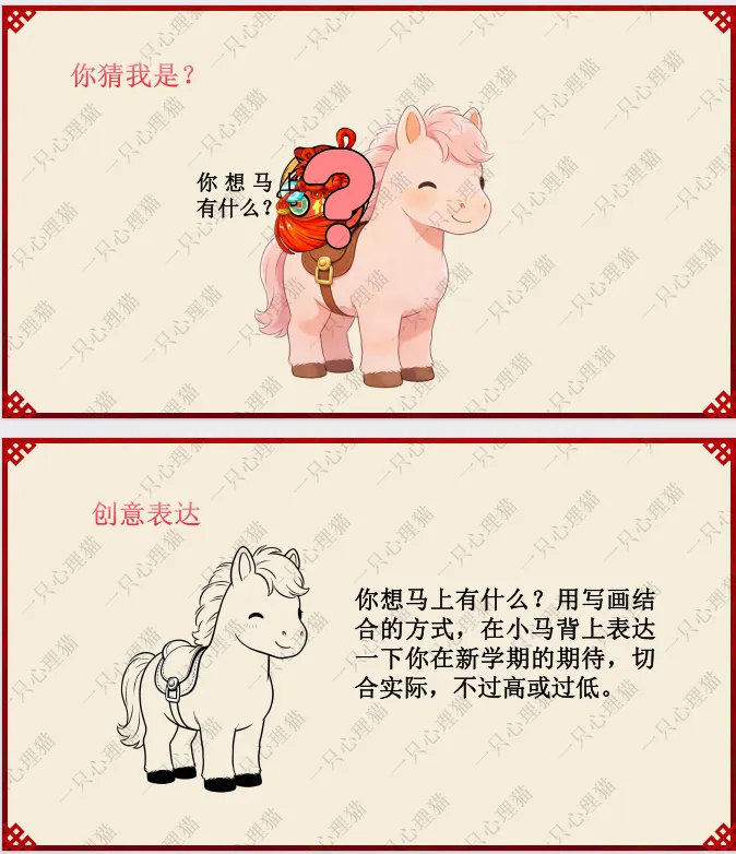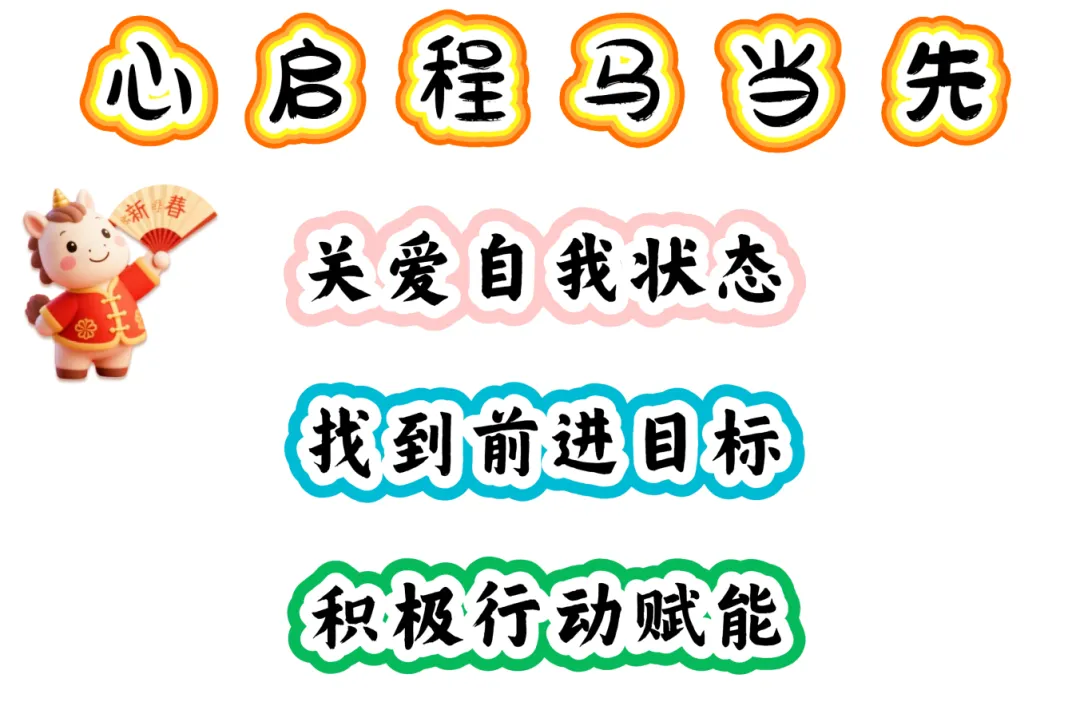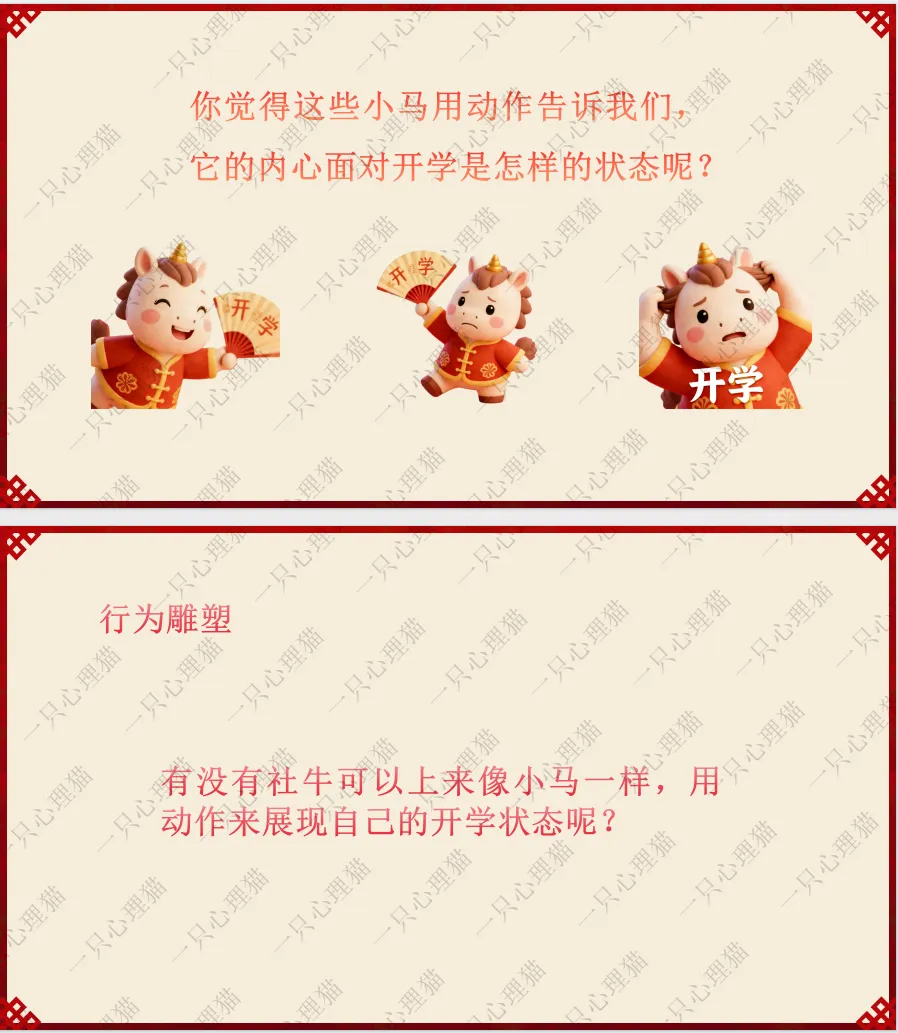 新学期伊始,面对从“假期模式”到“开学模式”的转换,许多学生难免出现兴奋、焦虑、迷茫等复杂情绪。为此,我们特别设计了一堂以“心启程,马当先”为主题的心理课。课程借助小马意象,结合萨提亚行为雕塑理论、SMART目标设定原则和积极心理学理念,引导学生觉察并接纳自己的开学情绪,用创意表达设定切合实际的新学期目标,并将目标拆解为具体行动,帮助学生平稳度过开学适应期,增强对新学期的希望感和行动力。