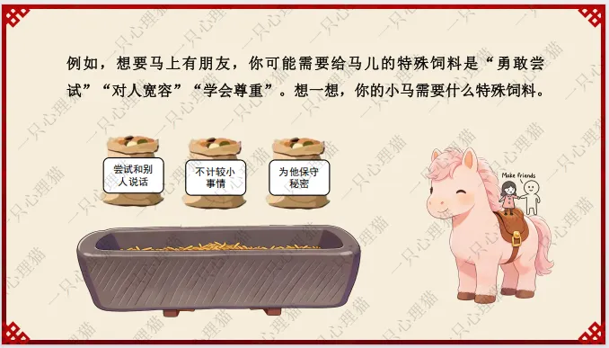 “要想马儿跑,饲料少不了”——教师以这一俗语引入,引导学生思考实现目标所需的“特殊饲料”。以“马上有朋友”为例,教师先说一说,避免学生不明就里。随后,学生在活动单背面写下或画下自己的“饲料清单”,将目标转化为可操作的行动步骤,初步建立起“目标-行动”的联结,增强对新学期的掌控感和行动力。