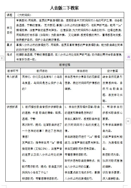 第 2 周 | 1. 学唱《大树妈妈》2. 聆听《春之歌》《绿色的祖国》3. 创编大树妈妈与小鸟的动作表演 | 2 | |