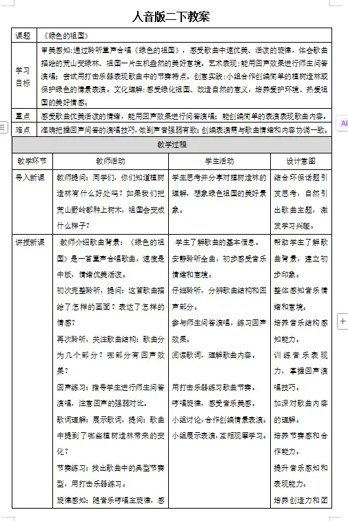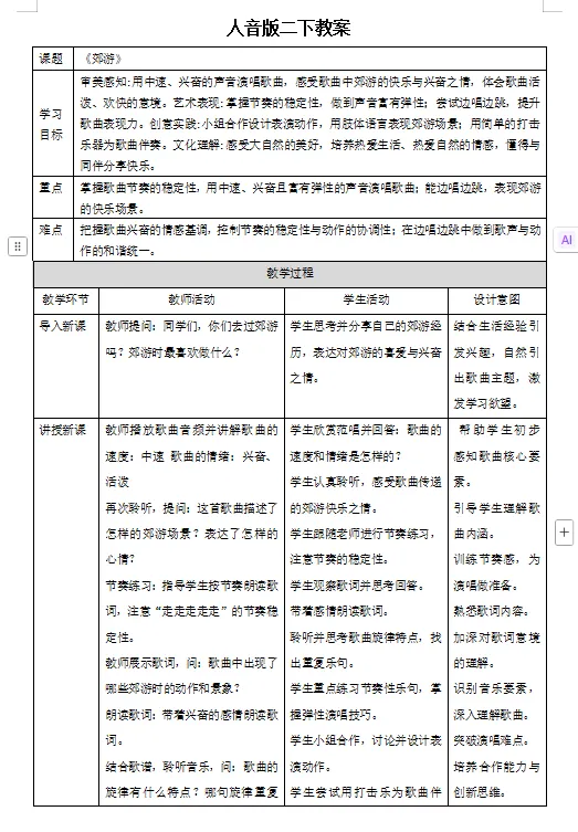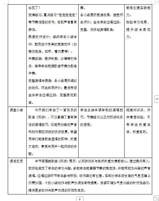 第 3 周 | 1. 学唱《郊游》2. 师生问答式演唱《绿色的祖国》3. 综合练习:边唱边跳表现郊游场景 | 2 | |