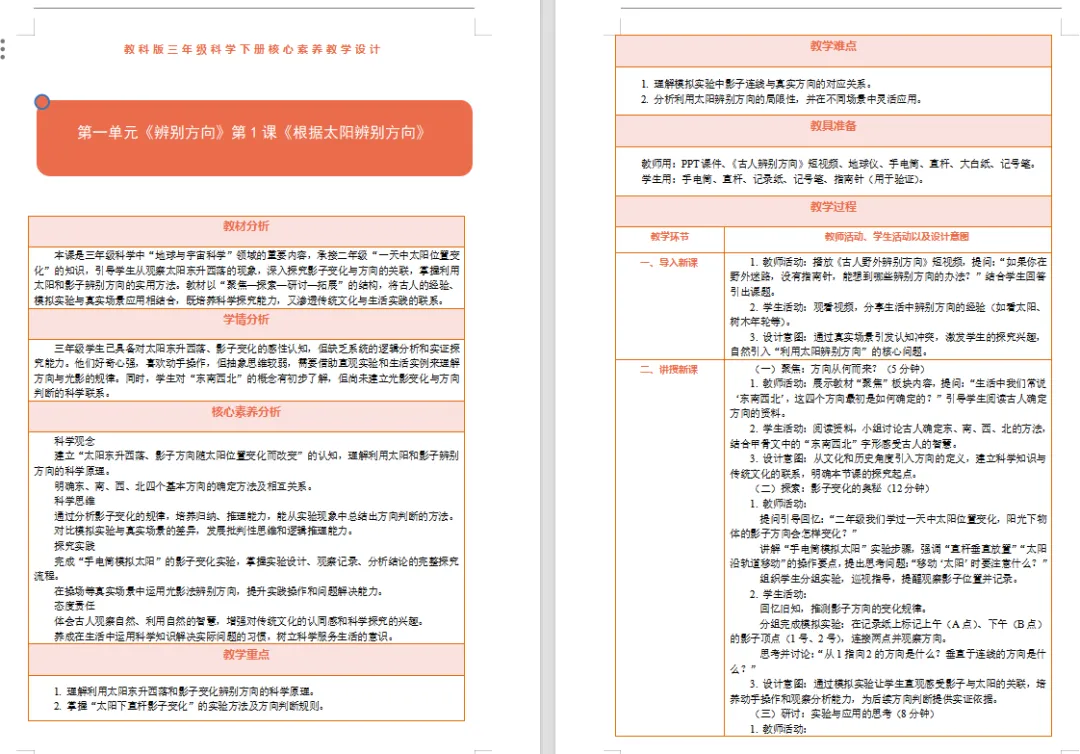 当前位置:首页>课件>【科学教案课件】新教材教科版版小学科学三年级下册全册大单元教学表格配套教案(含反思)第1课《根据太阳辨别方向》