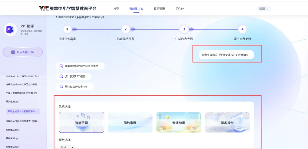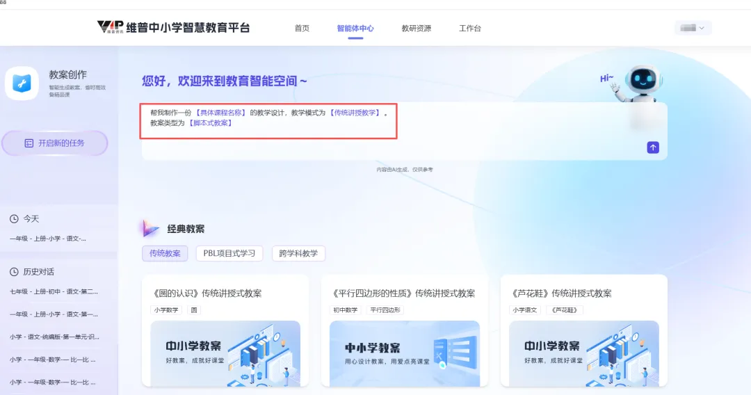 打开维普智教平台,进入智能体中心,选择课堂教学下的教案创作,选定课程名称,勾选教学模式(传统讲授、PBL 项目式、跨学科、大概念单元教学),选定教学类型(脚本式 / 纲要式教案),点击生成,AI 备课功能即刻启动!!