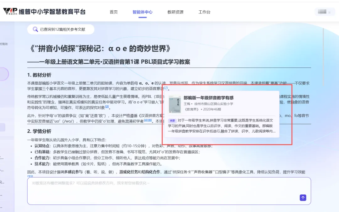 依托维普 3600 余种基础教育期刊资源,AI 智能匹配近 5 年核心论文,一键生成含教学目标、情境设计、跨学科整合方案的完整教案。更亮眼的是:每一项教学设计背后,均附参考文献溯源!教案既能直接落地使用,设计依据也清晰可查!!
