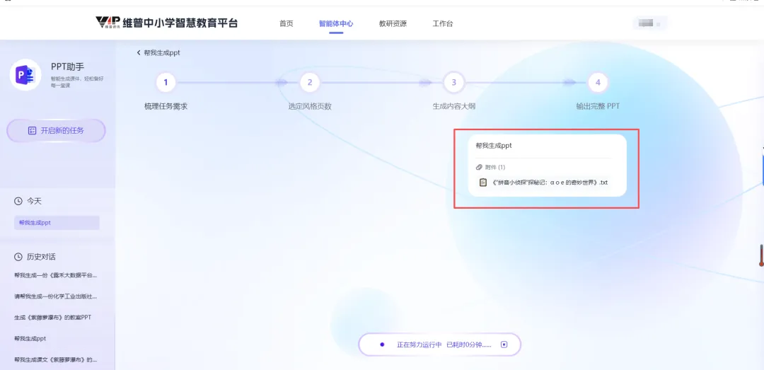 教案定稿后,以前要对着空白PPT发呆,现在只需点击PPT助手,上传教案文档或直接调用平台生成的AI教案。
