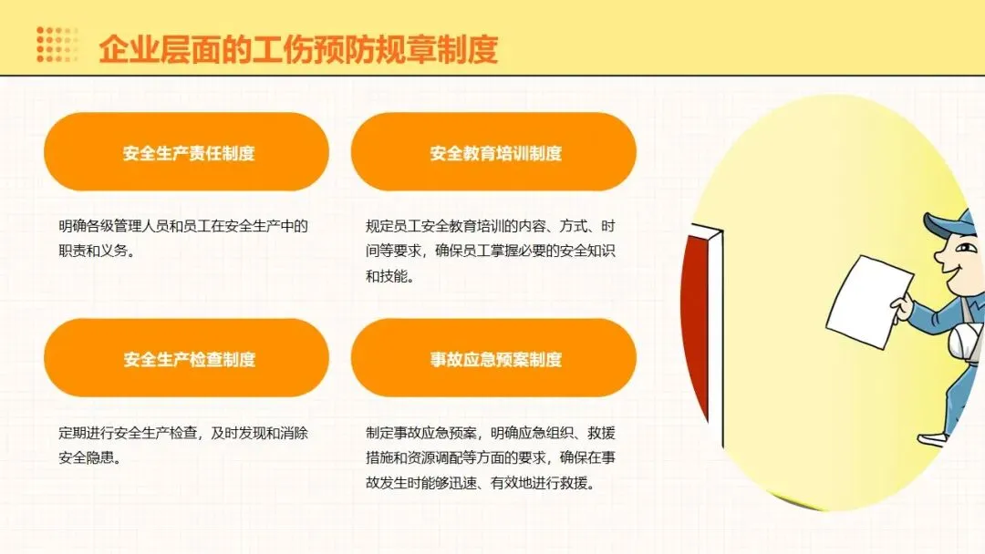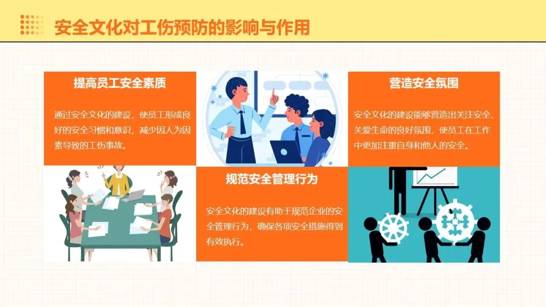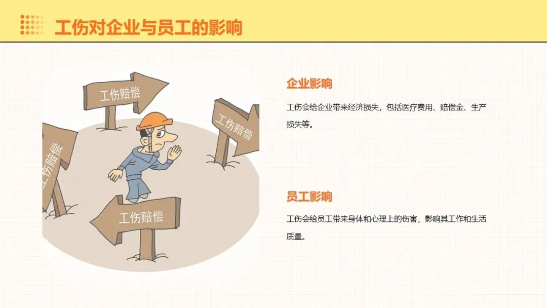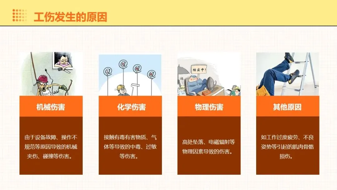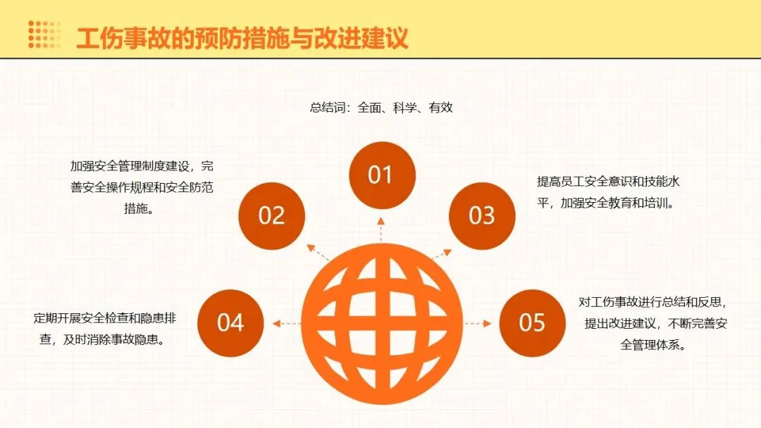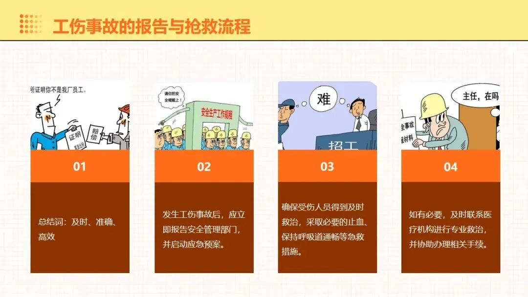 报告围绕工伤预防核心要点展开全面讲解,明晰工伤为工作时间和场所内因工作引发的事故伤害与职业病,梳理出设备、操作、环境、管理等方面的工伤诱因,阐述其对企业经济和员工身心的双重影响。课件强调安全意识培养的重要性,提出通过培训、制度、奖惩等方式提升意识,同时从多方面推进企业安全文化建设。课件明确工伤预防的具体措施,涵盖劳动防护用品的规范使用维护、安全生产操作规程的制定执行,以及工伤预防管理制度的建立完善。讲解事故应急处理与救援相关内容,包含应急预案制定实施、救援设备管理和员工自救互救能力培养。课件结合多类工伤事故案例分析原因,总结相应预防教训。介绍问卷调查、实操评估等培训效果评估方法,提出依据评估结果分析问题,针对性改进培训内容与方式,让工伤预防培训更贴合企业实际需求,提升培训实效性与实用性。