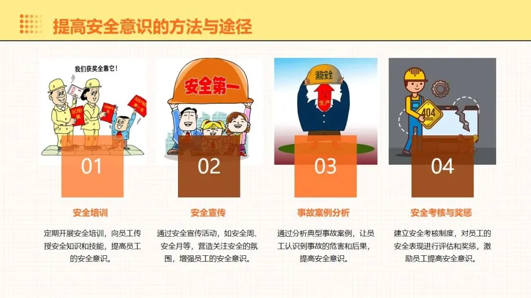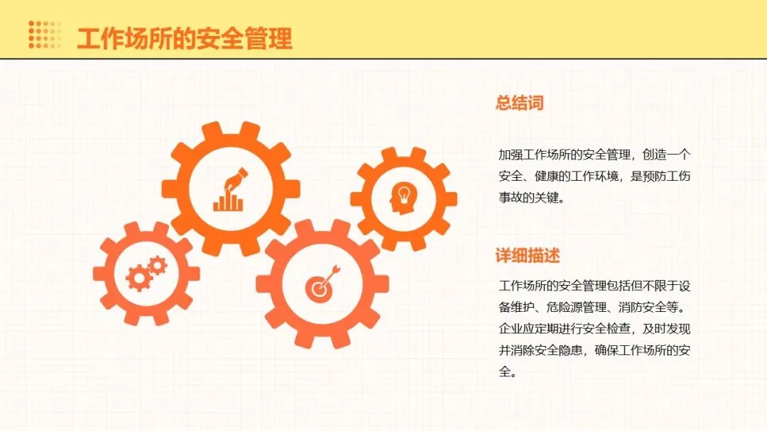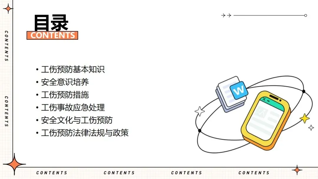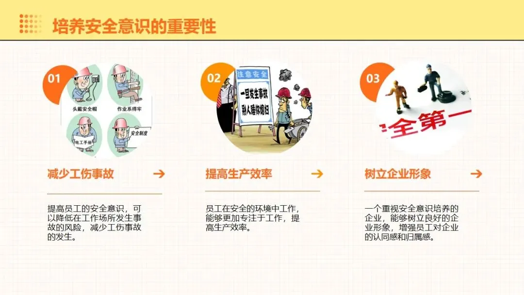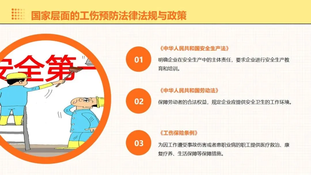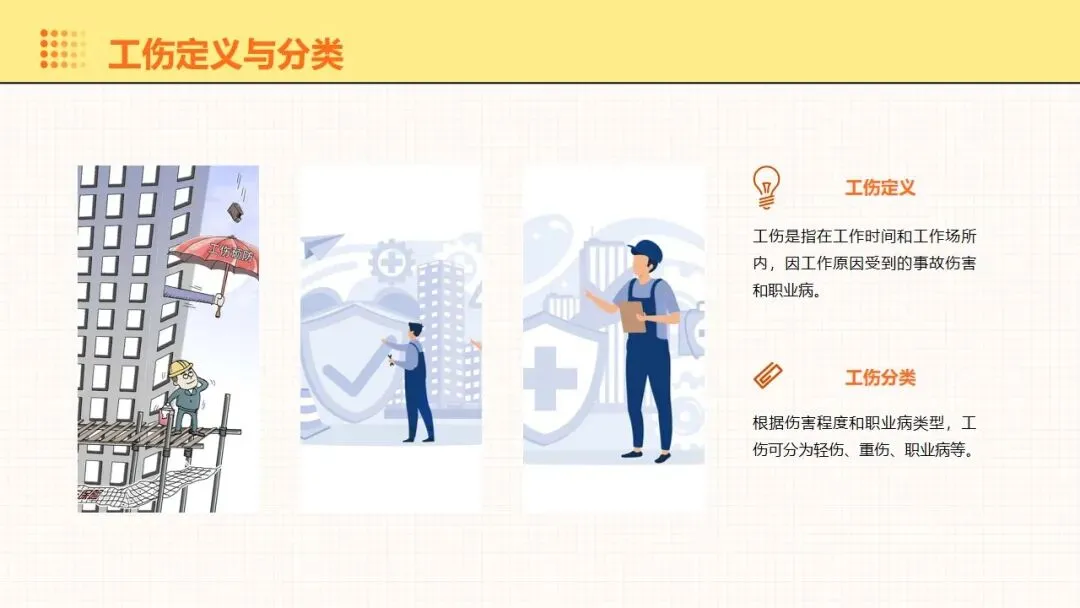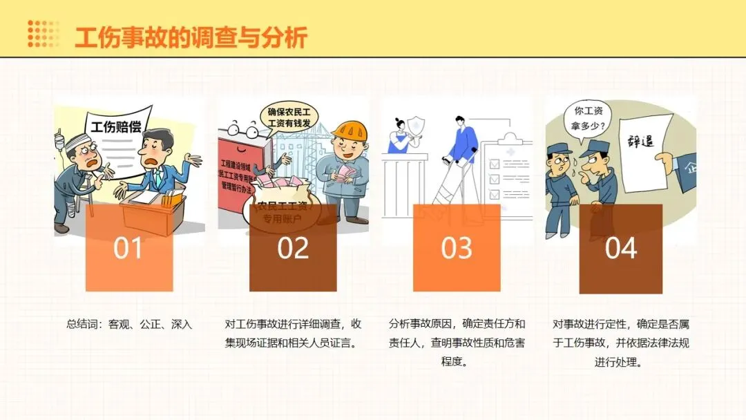 报告围绕工伤预防核心要点展开全面讲解,明晰工伤为工作时间和场所内因工作引发的事故伤害与职业病,梳理出设备、操作、环境、管理等方面的工伤诱因,阐述其对企业经济和员工身心的双重影响。课件强调安全意识培养的重要性,提出通过培训、制度、奖惩等方式提升意识,同时从多方面推进企业安全文化建设。课件明确工伤预防的具体措施,涵盖劳动防护用品的规范使用维护、安全生产操作规程的制定执行,以及工伤预防管理制度的建立完善。讲解事故应急处理与救援相关内容,包含应急预案制定实施、救援设备管理和员工自救互救能力培养。课件结合多类工伤事故案例分析原因,总结相应预防教训。介绍问卷调查、实操评估等培训效果评估方法,提出依据评估结果分析问题,针对性改进培训内容与方式,让工伤预防培训更贴合企业实际需求,提升培训实效性与实用性。