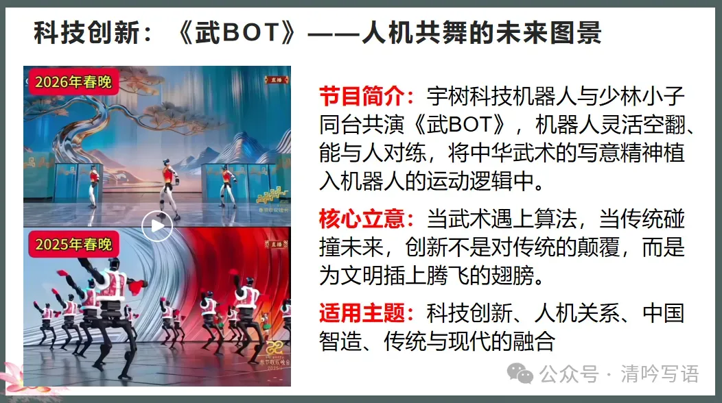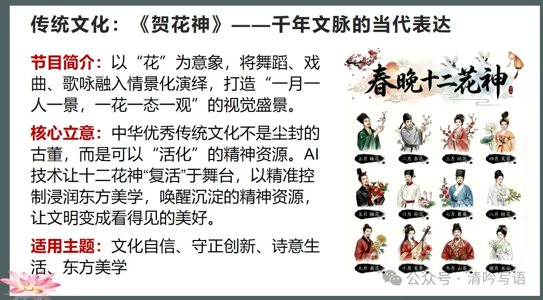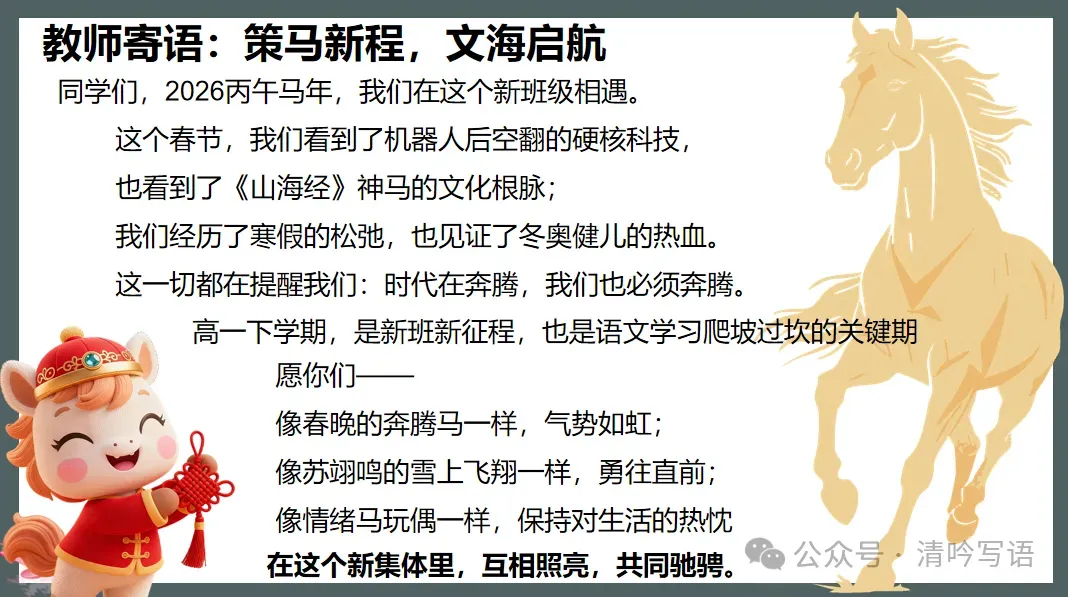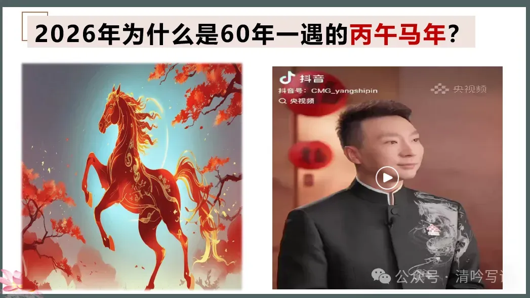 2026年,最短的学期,终于要开始了。当我们开始准备开学第一课的时候,就真的要开学了。那么开学第一课准备什么东西呢,首先是对寒假的回顾,假期做了什么事情,春节的热点有哪些。因此在制作开学第一课的时候,我准备了“马”的文化解读,关于名马和诗词。春节期间常在热点的贺花神,科技创新、电影《飞驰人生》。节目简介:以“花”为意象,将舞蹈、戏曲、歌咏融入情景化演绎,打造“一月一人一景,一花一态一观”的视觉盛景。