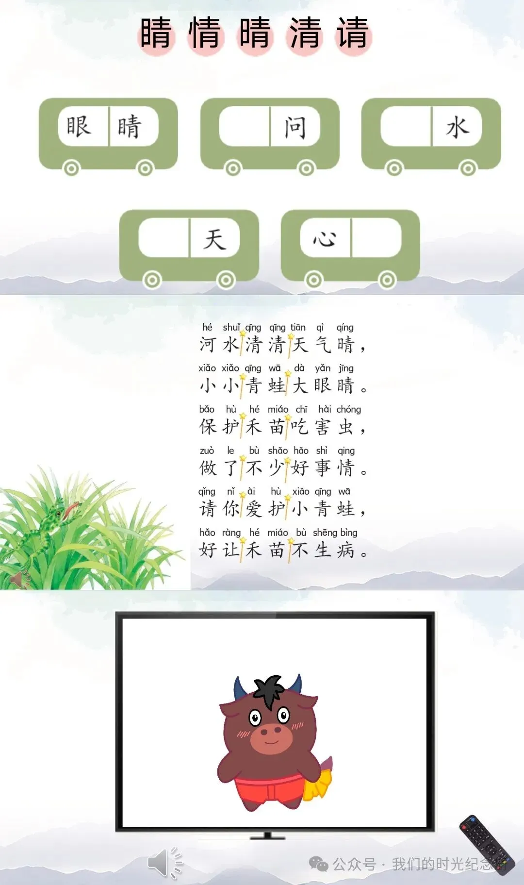 今天小青蛙要来考考小朋友,上节课学的生字,你还记得吗?依次出示字卡“清、晴,眼、睛”,学生“开火车”轮读。
