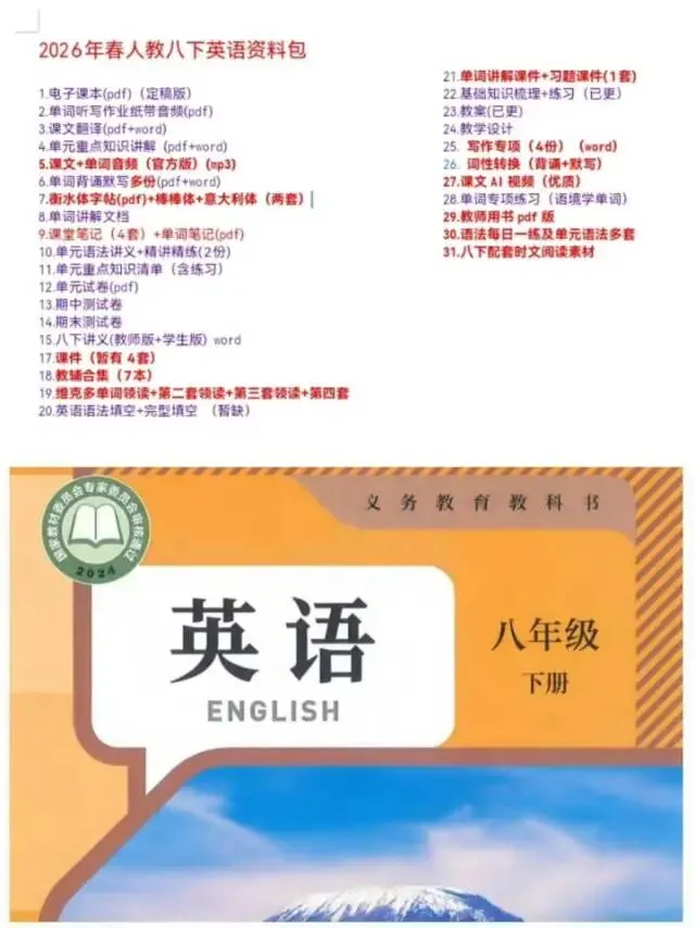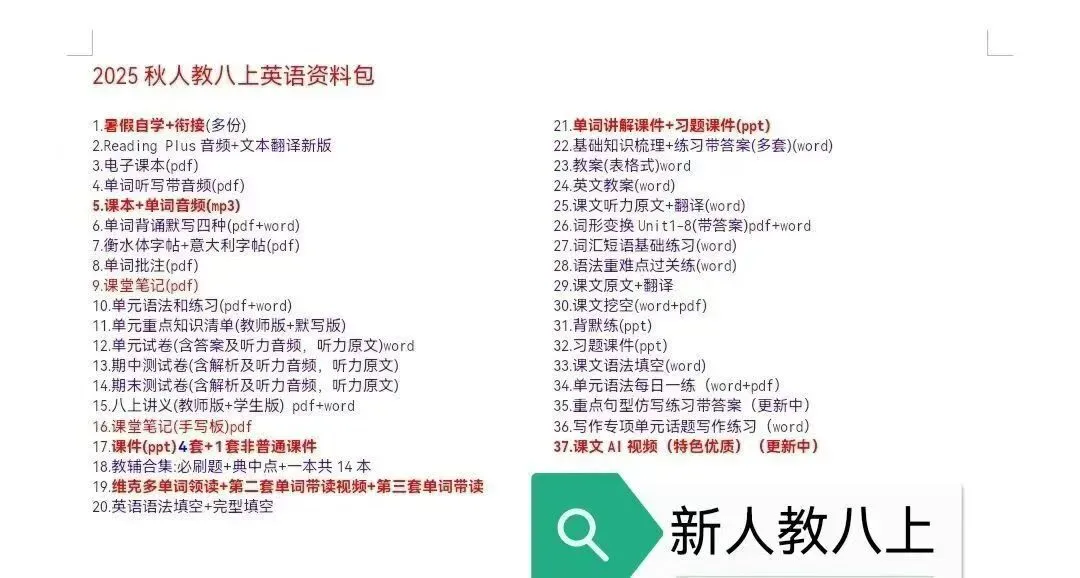 👆👆点击上方篮字关注我👆👆👆由于微信公号改版不再按时间流推送,互动少接收不到(及时)推送。即使是公众号粉丝也不一定能及时接受的到推送更新!推荐大家多点转发、点赞、在看(推荐)和留言,添加星标,分享给更多的朋友,这样不会迷路啦~开学在即,小编已整理了人教版新教材的资料包 ,目录如下: