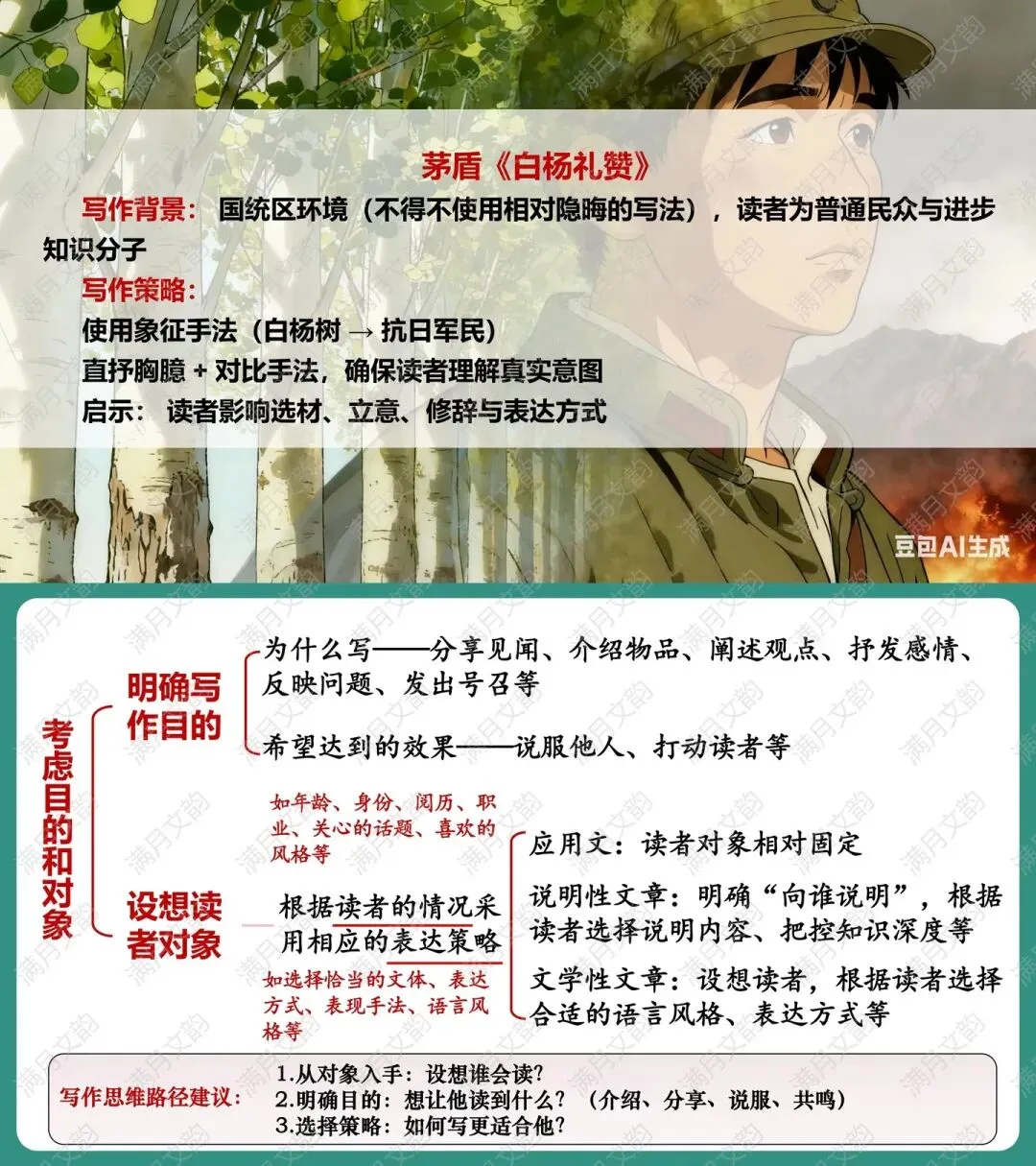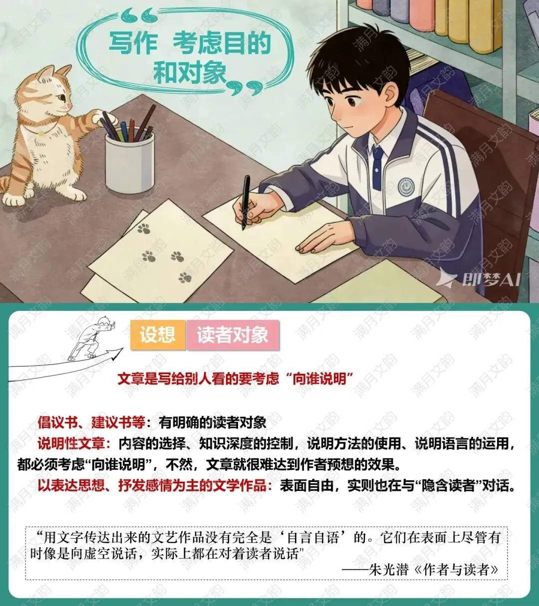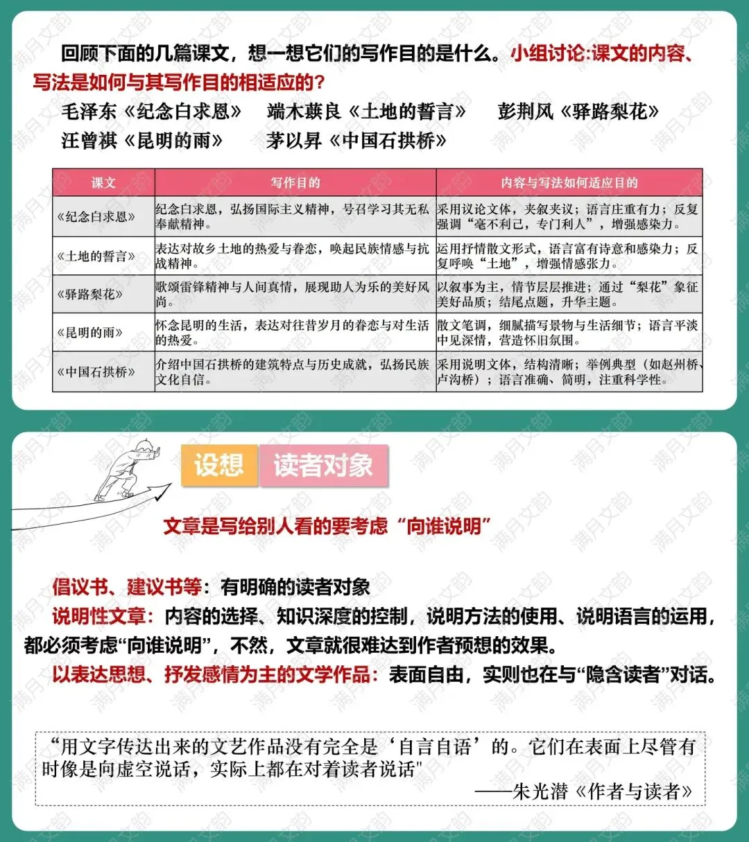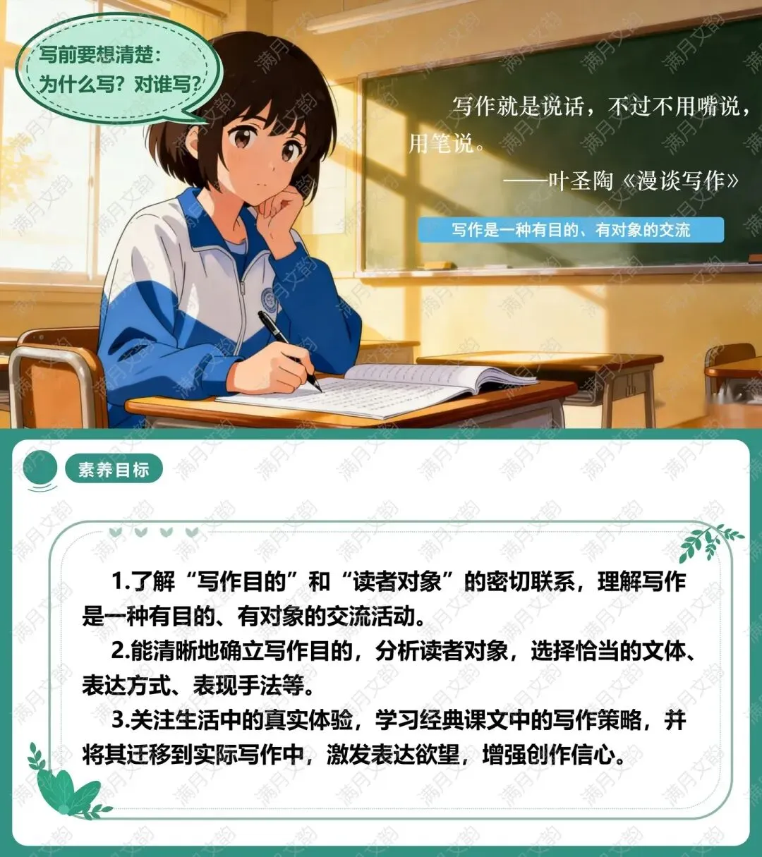 培养关键能力:训练学生能根据不同的“目的”和“对象”,灵活选择文体(比如用记叙文写经历还是用建议书提意见)、表达方式(是侧重描写还是说明)和写作手法。