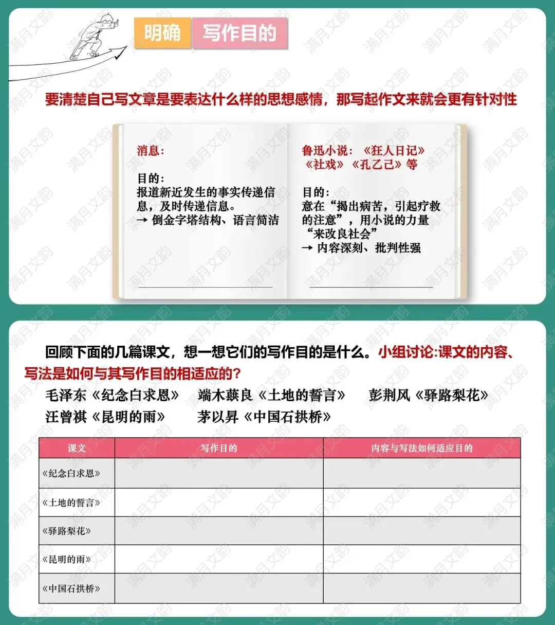 先用消息和鲁迅的小说为例,说明不同的写作目的(如传递信息、改良社会)决定了文章怎么写。再分组讨论本学期的课文(如《纪念白求恩》《中国石拱桥》),看看它们的写作目的是什么,内容又是如何配合目的的。