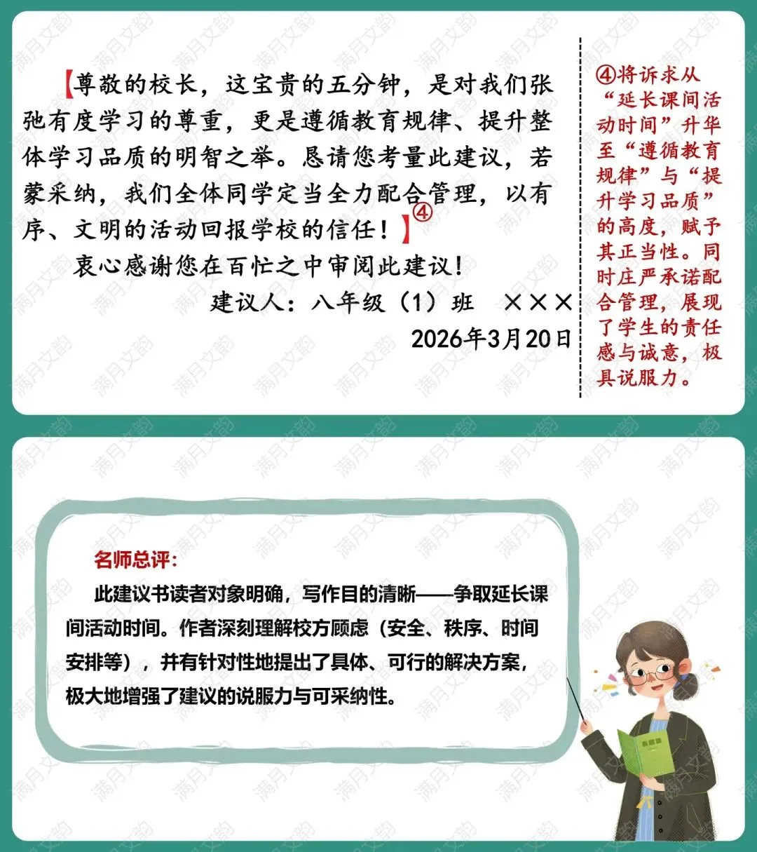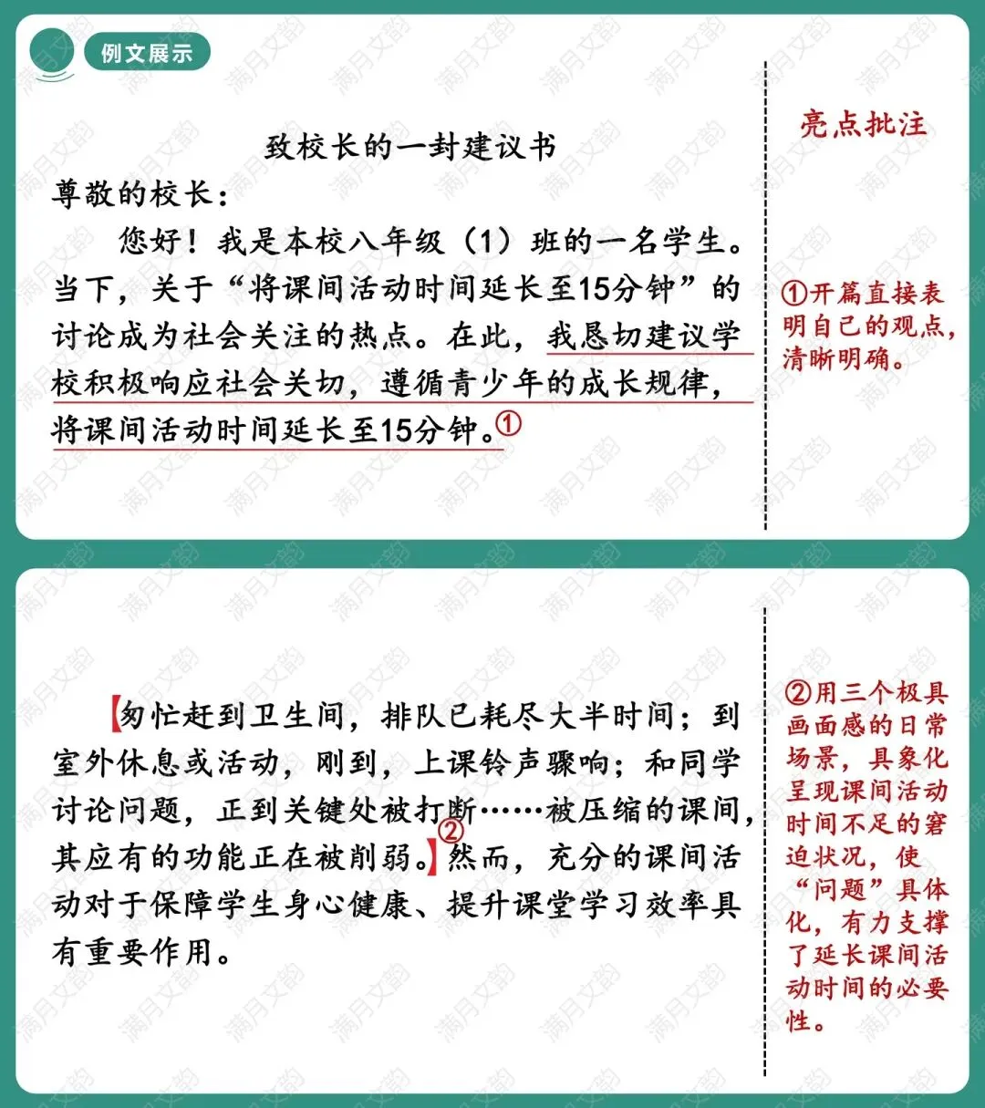 应用文写作(任务二):写一份给校长的建议书,对“目的与对象”精确运用。通过一篇优秀的《建议延长课间活动时间的建议书》范文和批注,展示如何精准预判读者(校长)的顾虑,提出具体可行的方案来说服他。