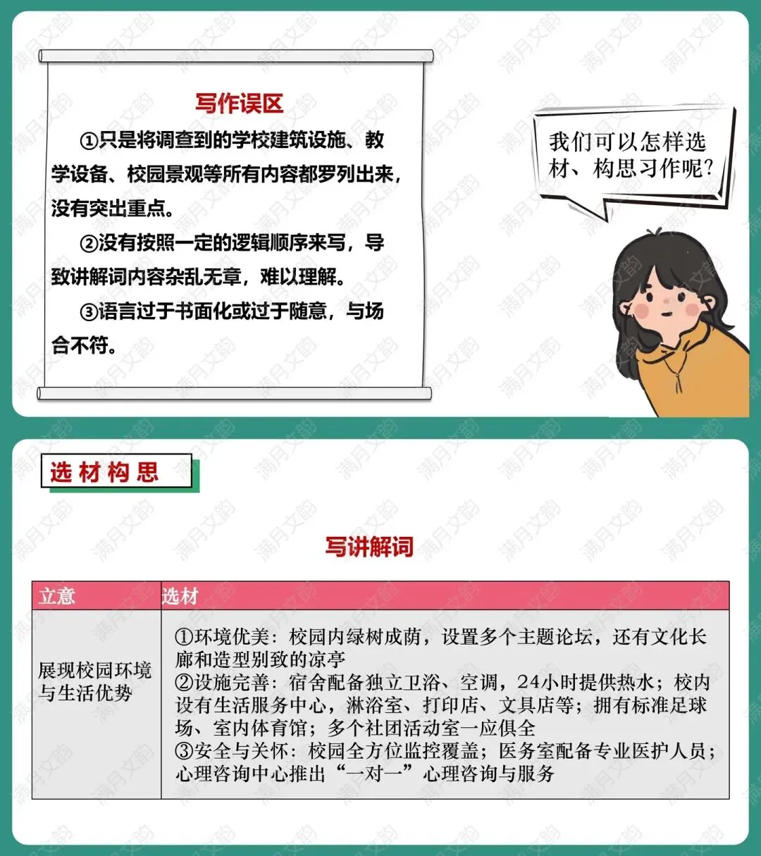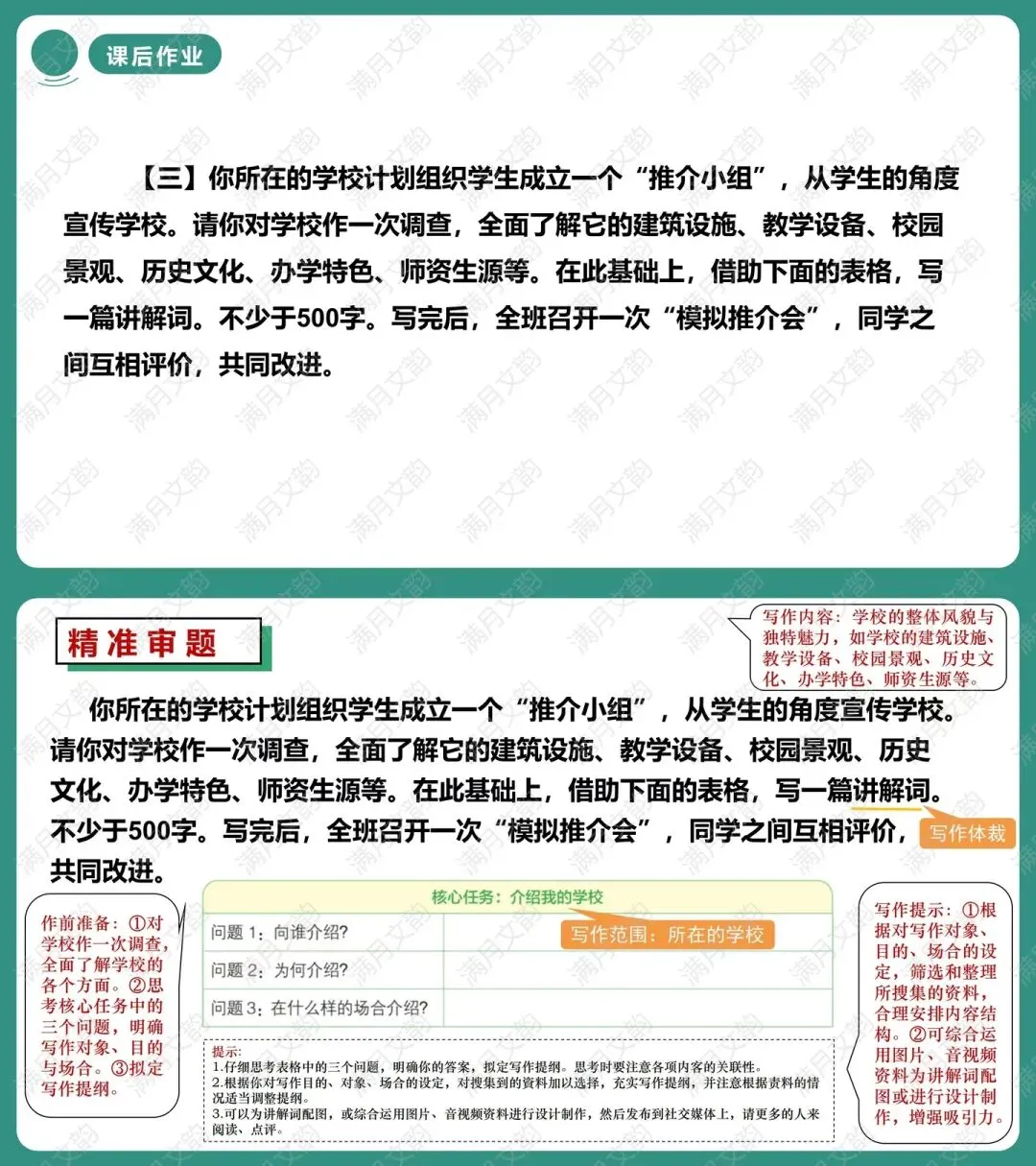综合能力挑战(任务三):撰写学校讲解词。先做调查,再围绕主题(学校特色、历史或景观),有重点有逻辑地组织材料,用适合口头讲解的语言写出来。最后通过模拟推介会,互相评价共同修改,锻炼综合表达能力。