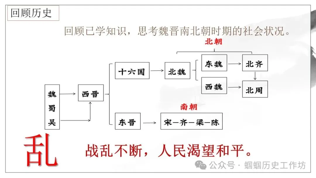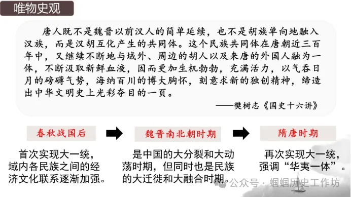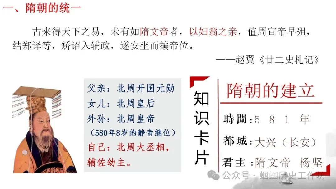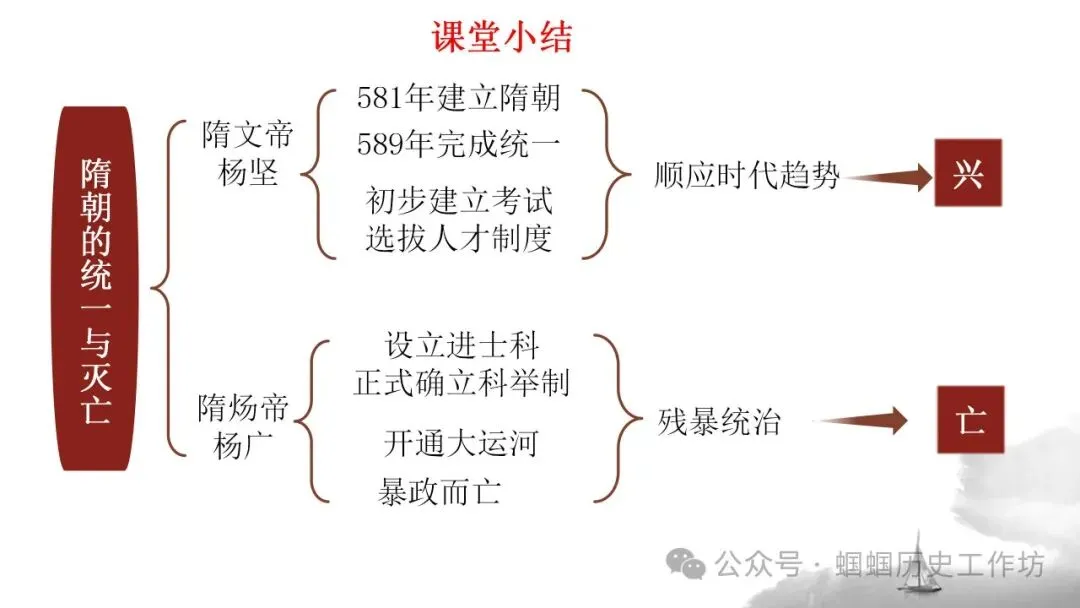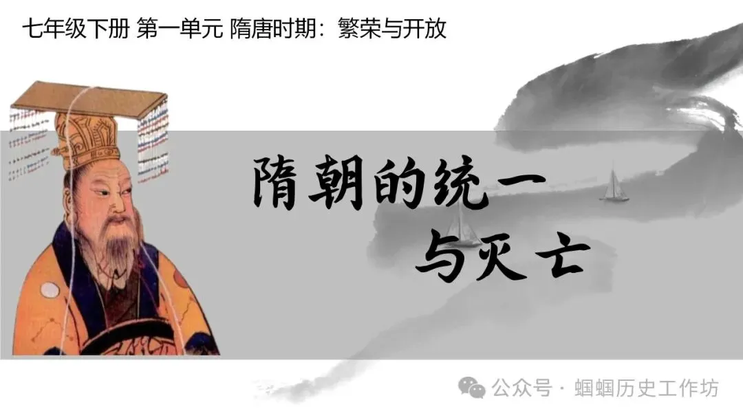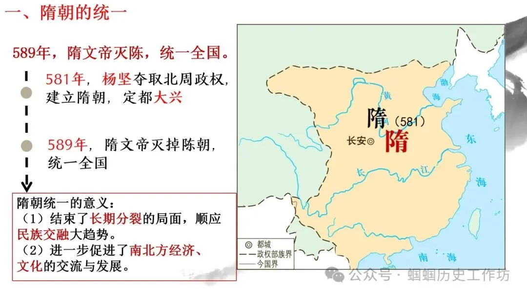 2、统一:589年,隋文帝灭掉陈朝,统一全国。隋的统一,结束了长期分裂局面,顺应了民族交融的大趋势,进一步促进了南北方经济、文化的交流和发展。