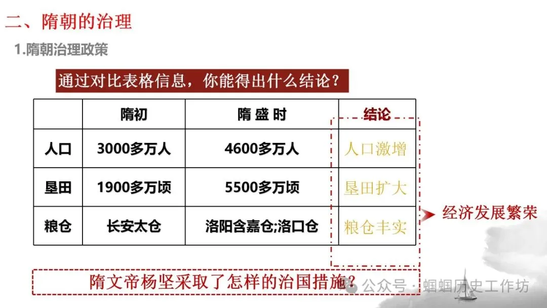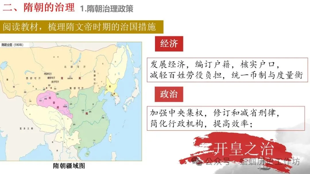 3、巩固统治:经济上:发展经济,编订户籍,核实户口、减轻百姓赋役负担,统一币制和度量衡;政治上:加强中央集权,修订和减省刑律,简化行政机构,提高效率。隋朝经济迅速恢复和发展,人口数量和垦田面积大幅增长,成为国力强盛的王朝。