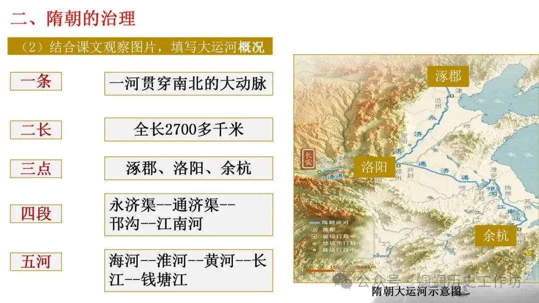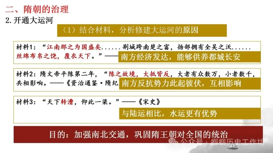 1、目的:加强南北交通,巩固隋朝对全国的统治。