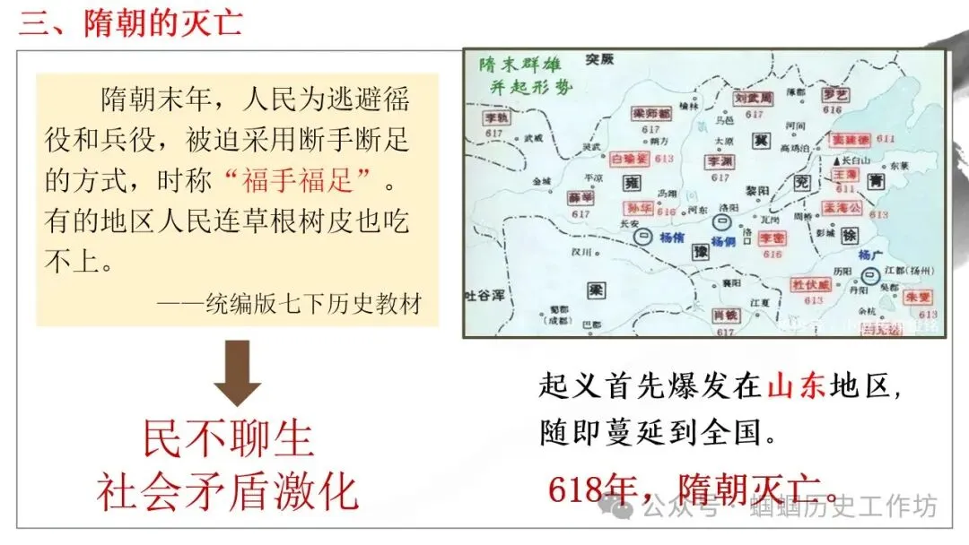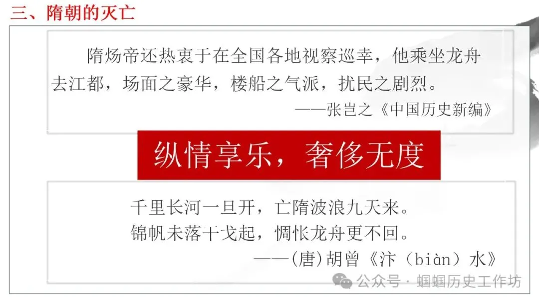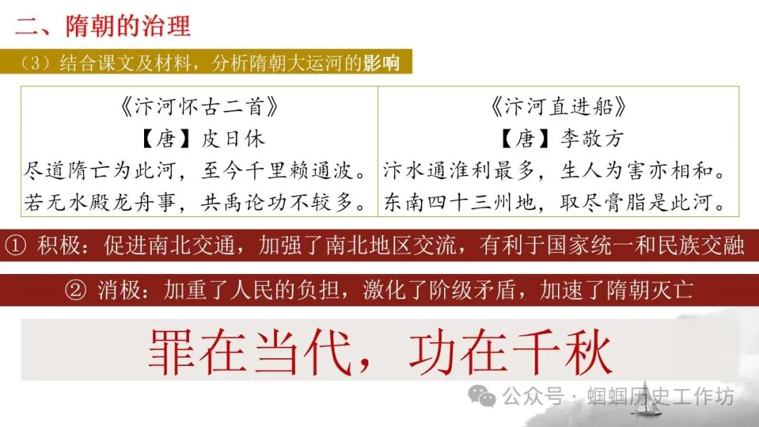 ③辩证分析隋炀帝的功与过,同时认识到得民心者得天下的道理。(唯物史观、家国情怀)