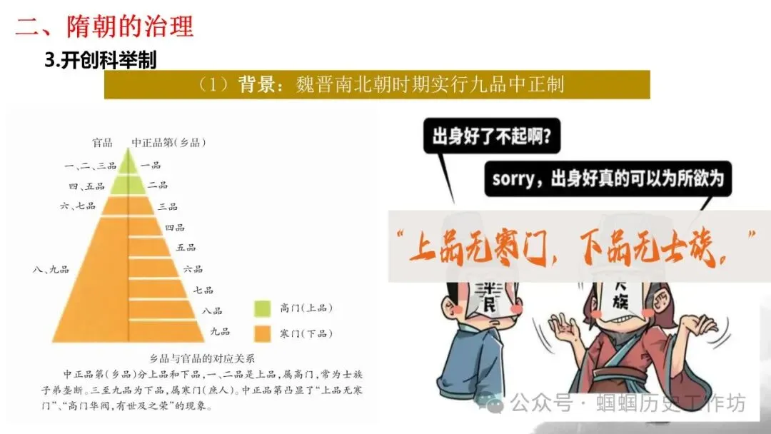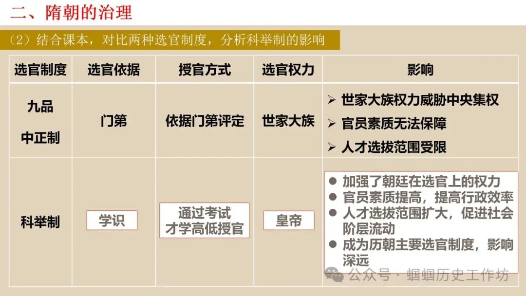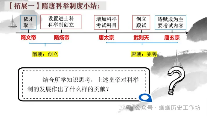1、建立:隋文帝,废除前朝选官制度,依才能取士;隋炀帝,设置进士科,标志着通过考试选拔人才的科举制创立。
