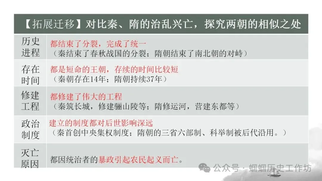 探究六:问题:【小组讨论】隋朝与中国古代哪一个王朝最为相似?相似之处有哪些?(可从朝代更替、工程、制度、灭亡等角度思考)