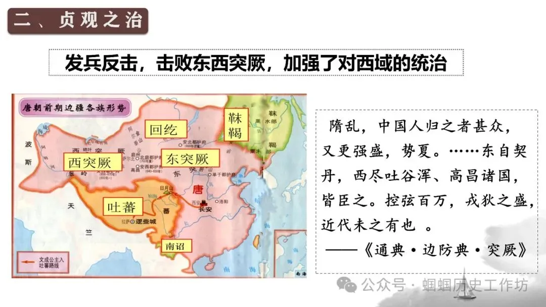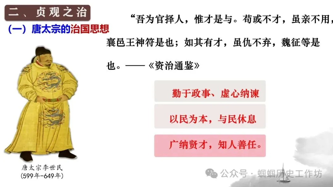 2、治国思想:吸取隋朝速亡的历史教训,励精图治、勤于政事,澄清吏治、虚心纳谏,从善如流,戒奢从简,施行与民休息的政策,广纳贤才,知人善任。当时人才有魏征、房玄龄、杜如晦等。