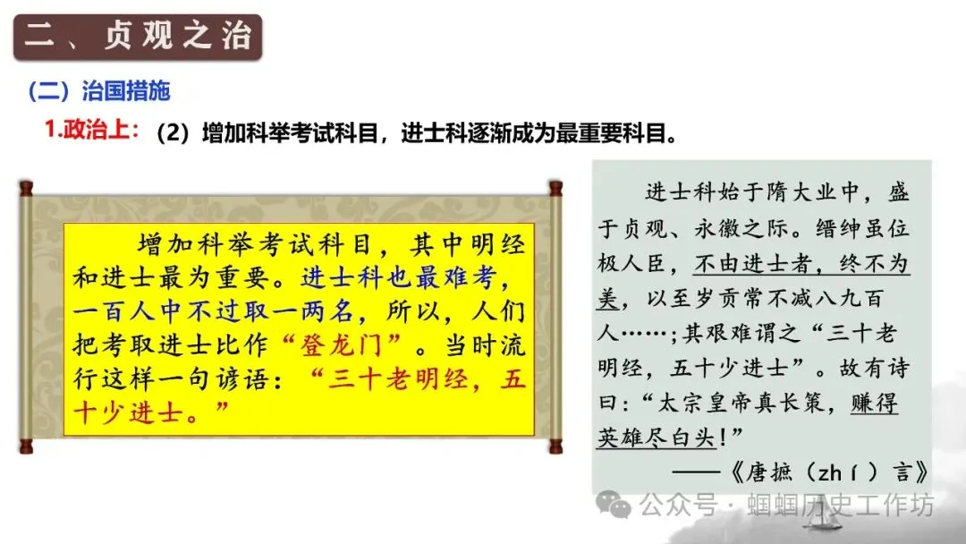 唐太宗:增加科举考试科目,鼓励士人报考,进士科逐渐成为最重要的科目。