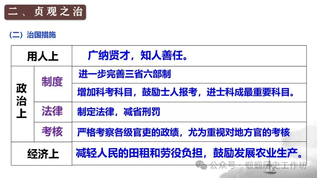 ①政治上,进一步完善三省六部制;制定法律,减省刑罚;严格考察各级官吏的政绩;