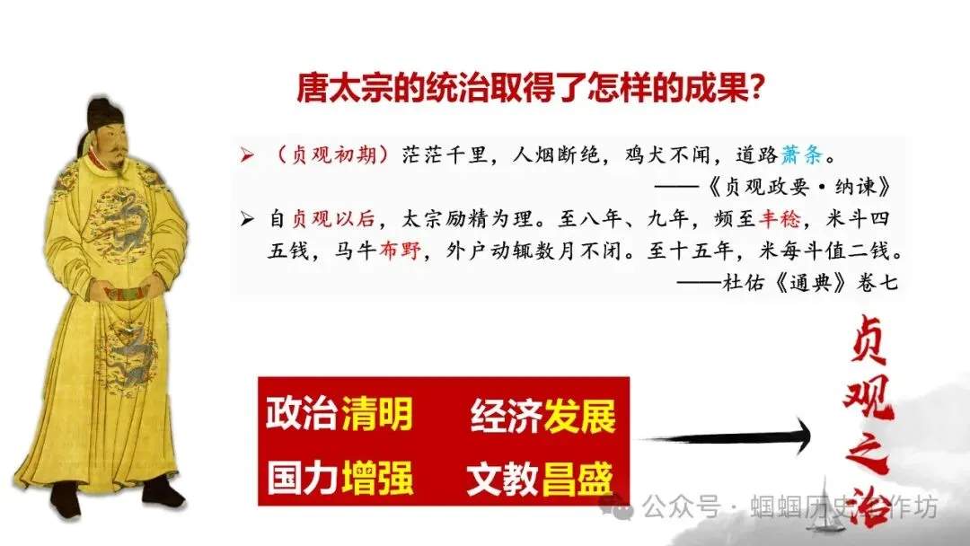 4、治国效果:政治比较清明,经济得到恢复和发展,国力增强,文教昌盛,各族友好关系进一步发展,历史上称为“贞观之治”。