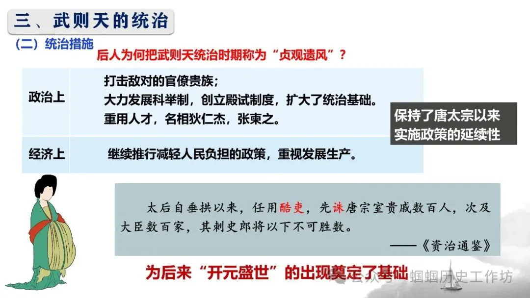 解析:武则天在位期间创立殿试,不拘一格选拔人才;注重发展生产,推动社会经济文化持续发展。不仅延续了贞观之治的盛世,也为后来的开元盛世奠定了坚实的基础。