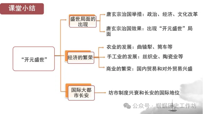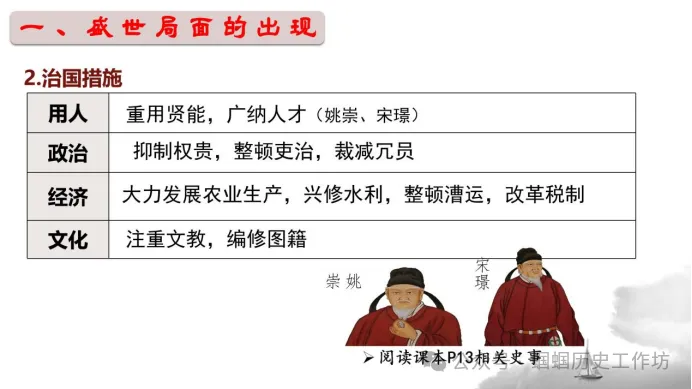 (3)措施:稳定政局,励精图治,重用贤能,在贤相姚崇和宋璟的辅佐下,实行了一系列改革:政治上,抑制权贵,整顿吏治,裁减冗员;经济上,大力发展农业生产,注重兴修水利,整顿漕运,改革税制;文化上,注重文教,编修图籍。
