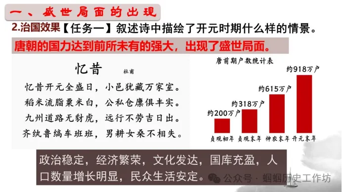 3、影响:这期间,经济得以持续发展,社会相对安宁,人口不断增长,为后来开元盛世局面的出现奠定了基础。