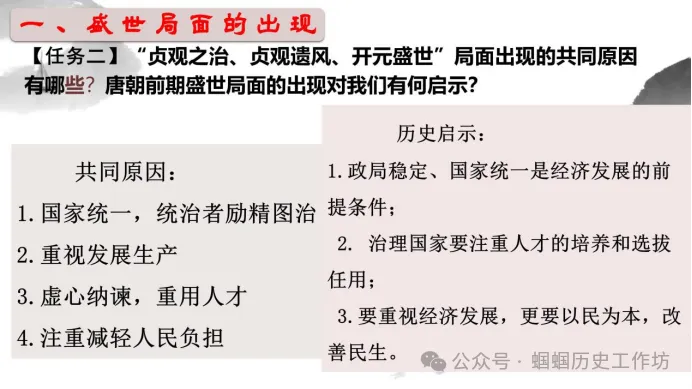 探究二:问题:根据表格信息归纳唐朝前期盛世局面形成的共同原因及历史启示?
