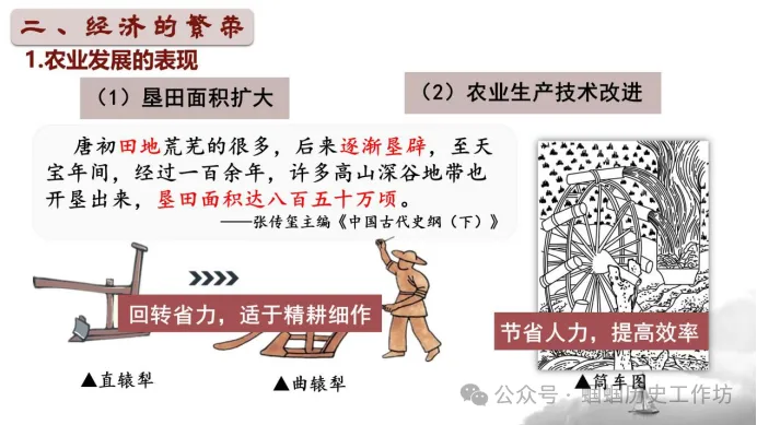 ②农业生产技术不断改进,发明并推广曲辕犁、筒车等重要的生产工具;