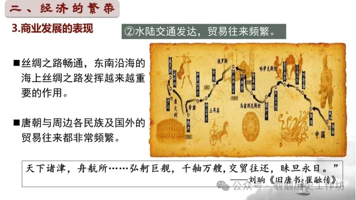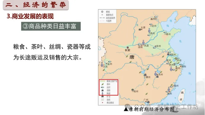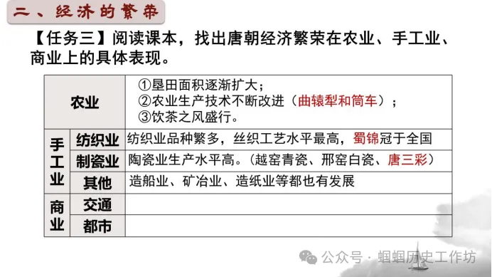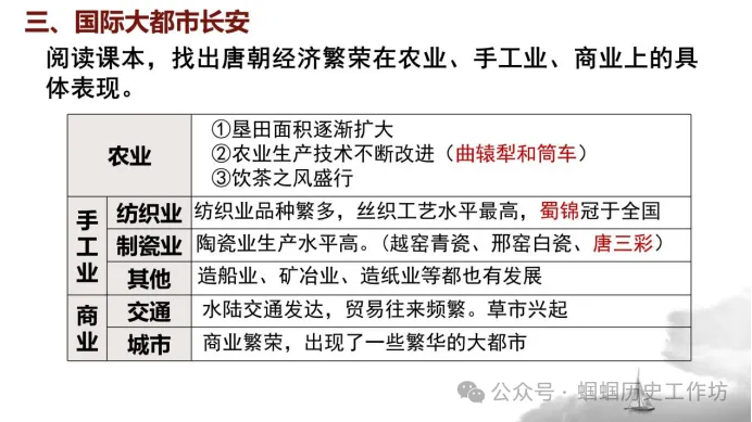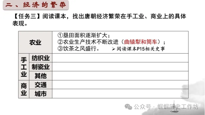 ②从农业、手工业、商业三个方面了解唐朝前期经济繁荣的表现。(史料实证、唯物史观)