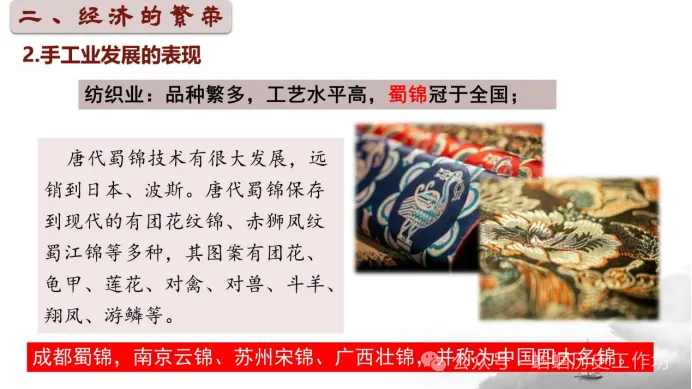 ①纺织业品种繁多,丝织工艺水平最为突出,蜀锦冠绝全国;