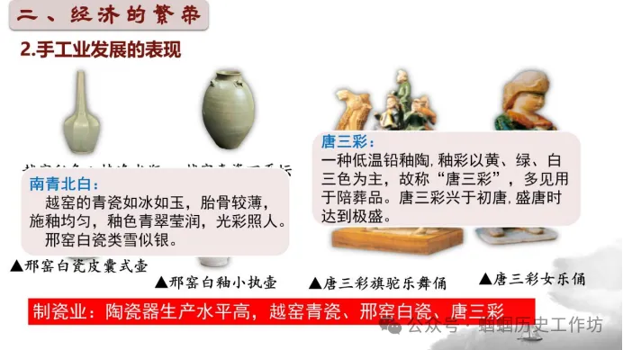 (2)陶瓷业:越窑的青瓷、邢窑的白瓷、唐三彩;