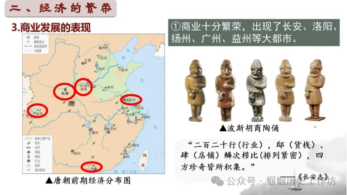 3、商业:长安是当时中国政治、经济和文化交往的中心,也是一座国际性的大都会