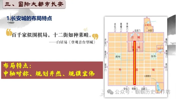 (3)地位:长安城既是政治、经济、文化交流中心,也是闻名中外的国际大都市。