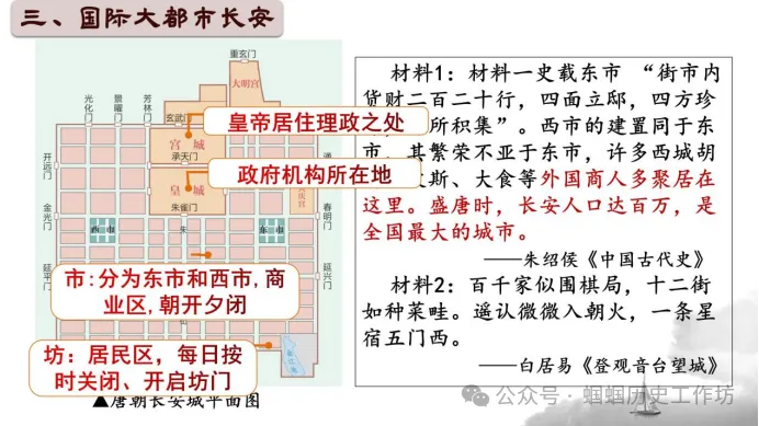 (2)布局:长安城分为宫城、皇城和外郭城。宫城是皇帝起居和办公的地方,皇城是中央官署所在地,外郭城实行坊市制度。坊为居民居住区,市为商品交易区,两者有严格的区分。后来,随着城市和商品经济的发展,坊市制度逐渐松弛。