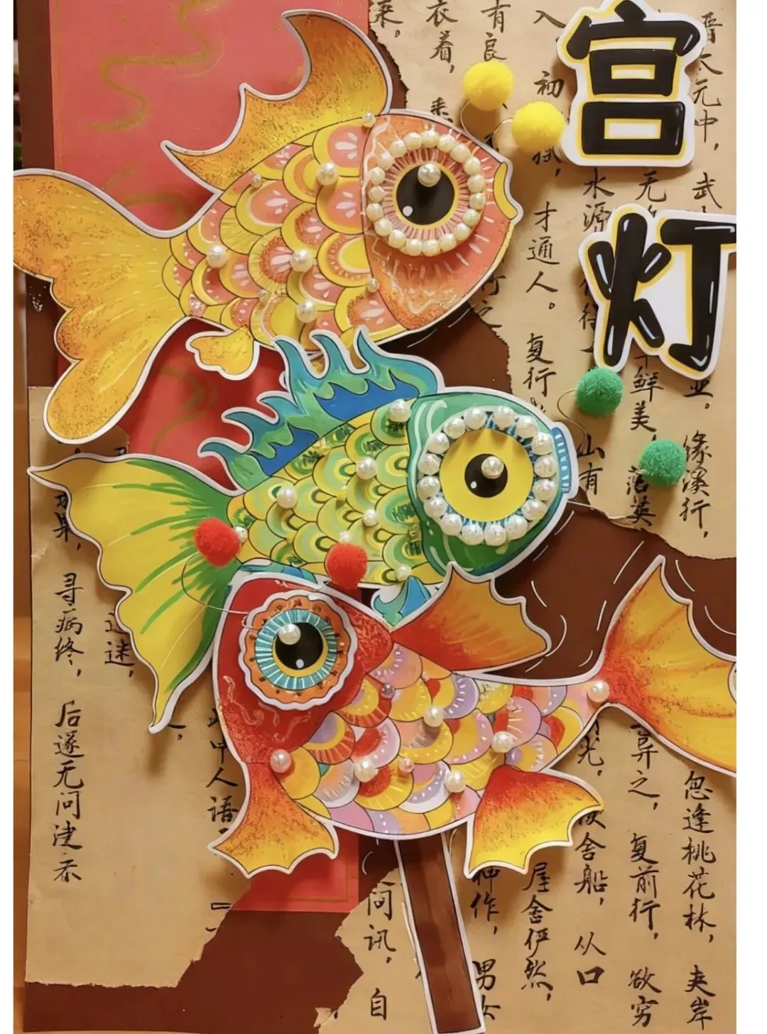 5. 装饰美化:用装饰笔画出鱼鳞、花纹,贴上亮片、眼珠、流苏,让鱼灯更生动。